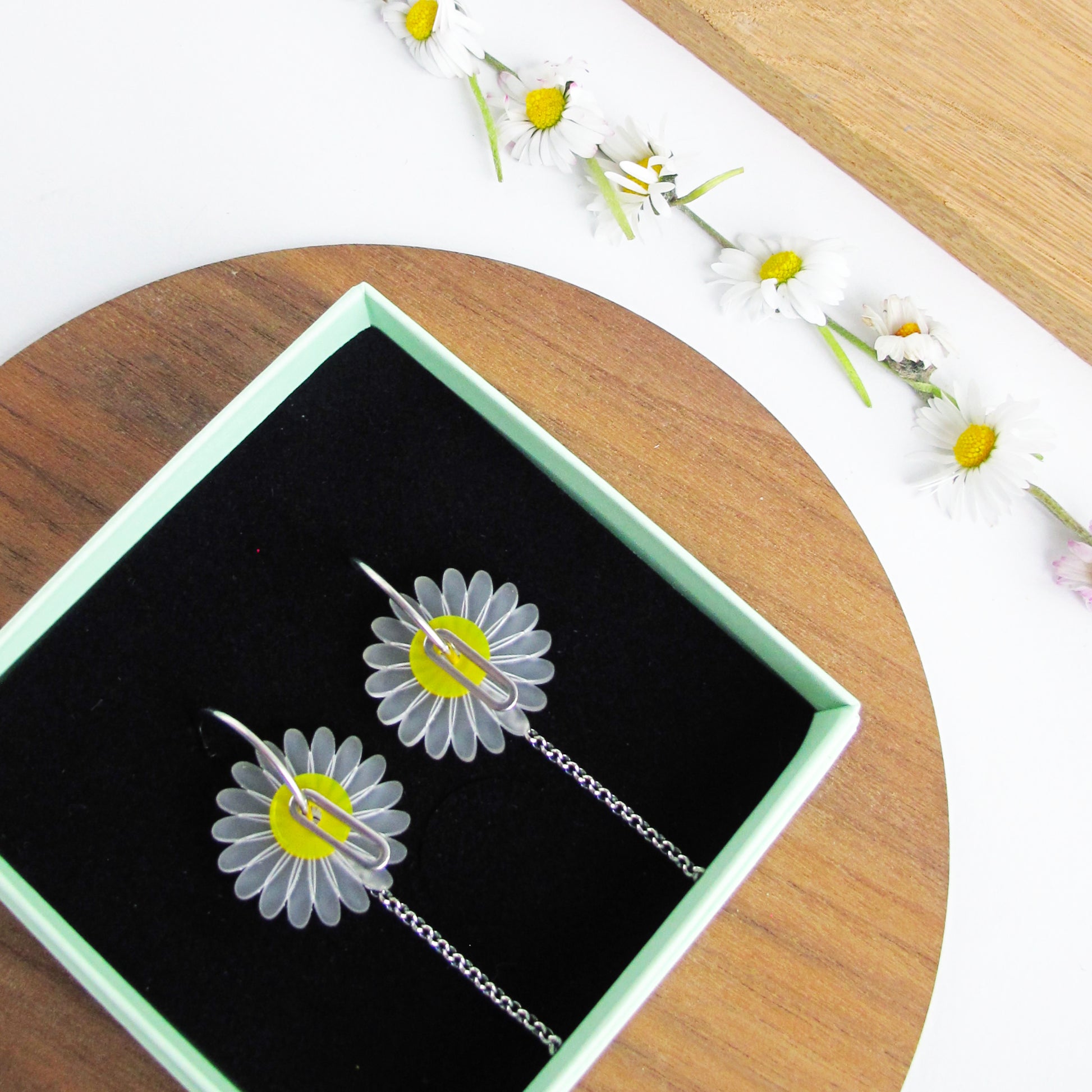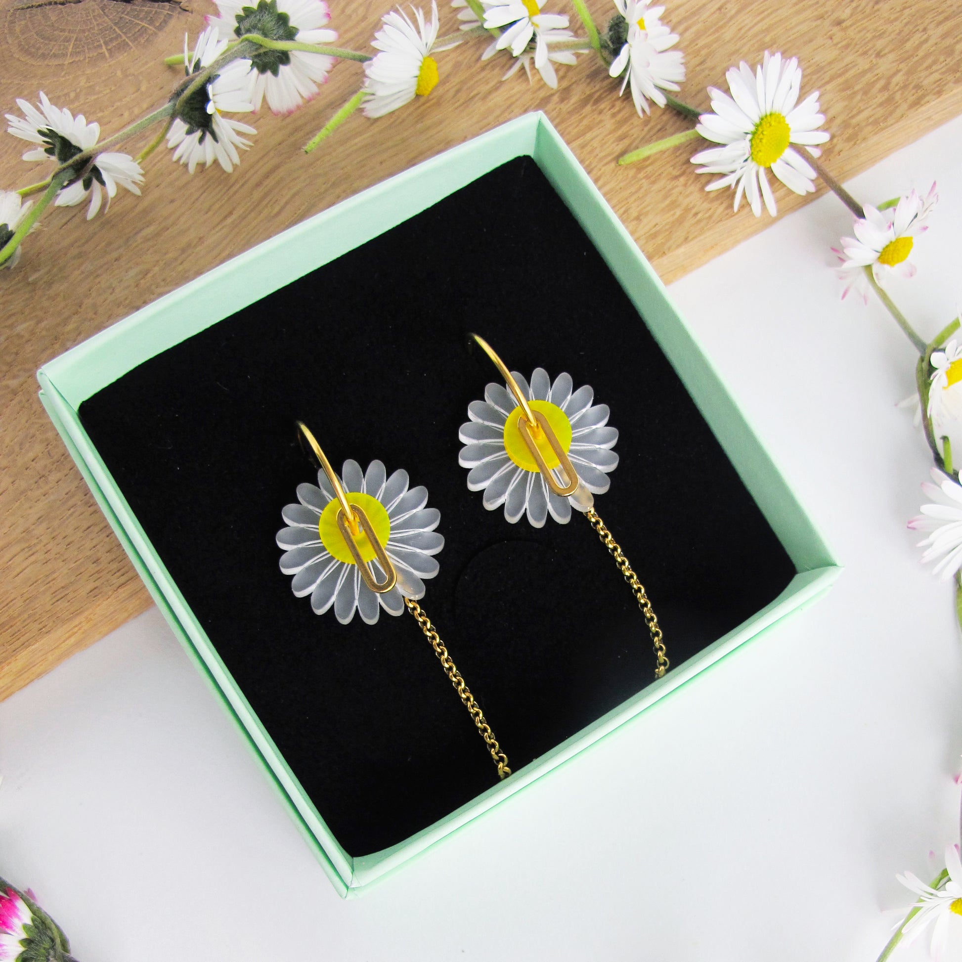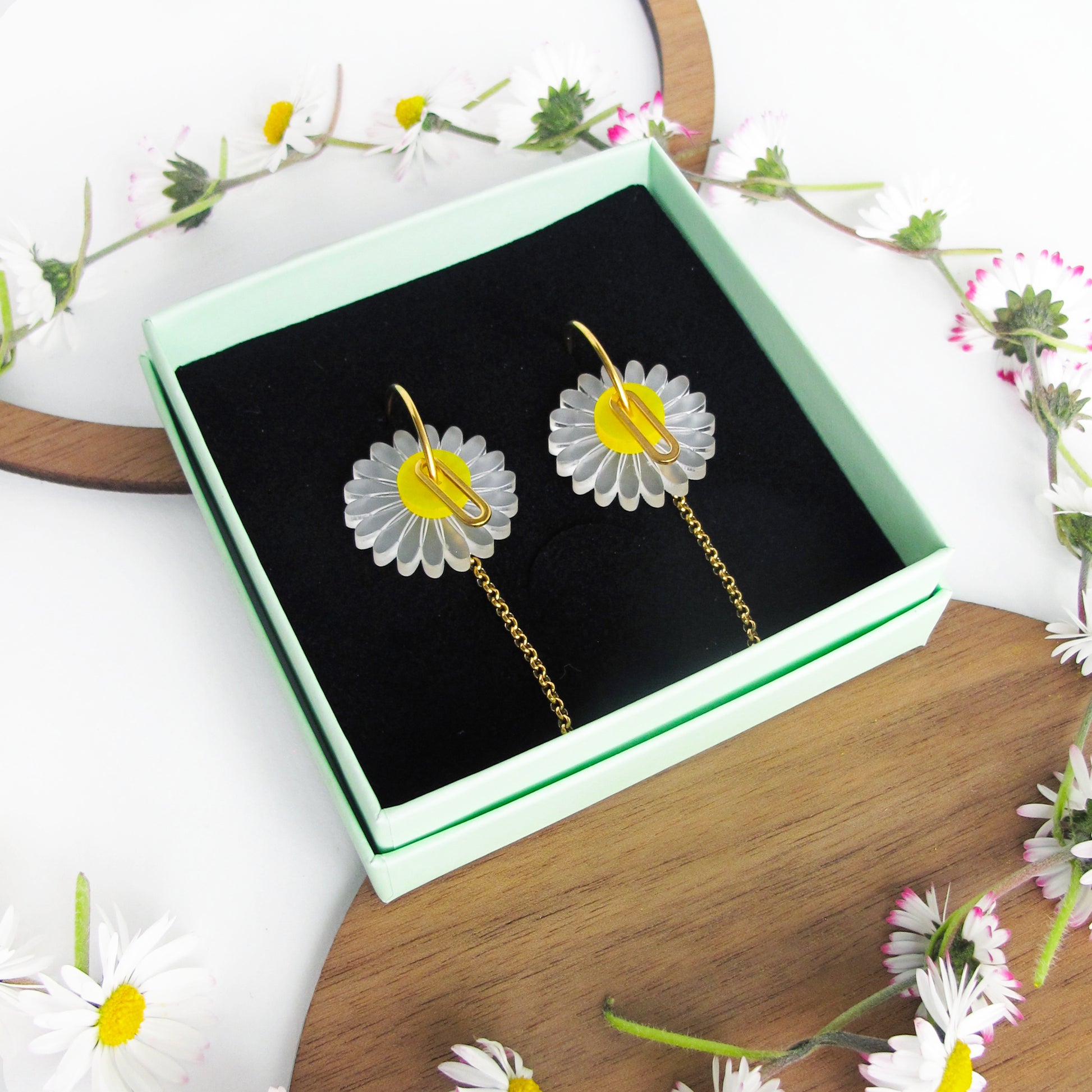 Deze madeliefjes oorbellen zijn modulair, zo kan je de oorbellen met of zonder het kettinkje en ovaaltje dragen. Er is de keuze uit roestvrijstaal goud en zilver.