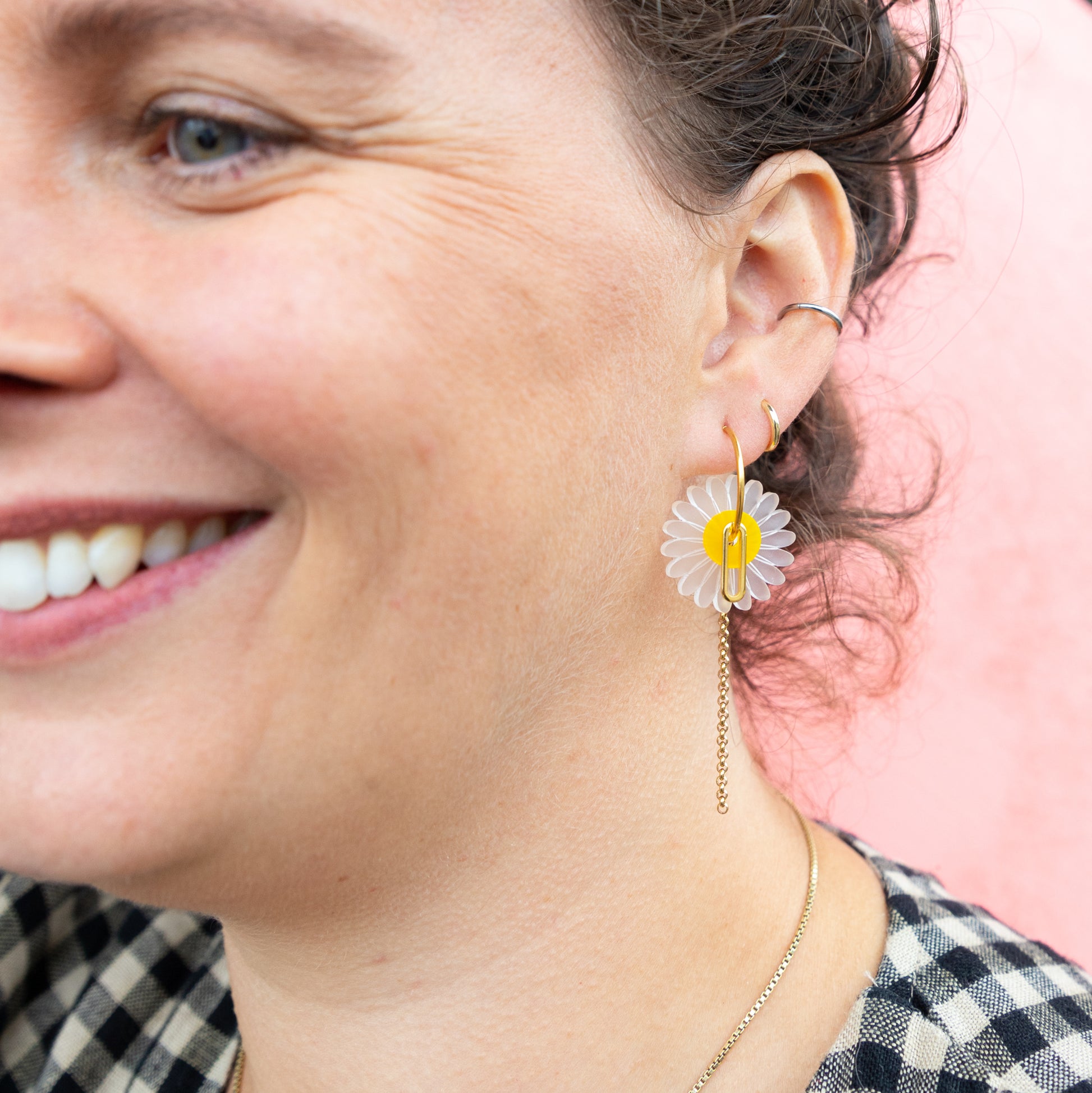 Het madeliefje voelt als 100% jeugdsentiment doet denken aan heerlijk lummelen buiten in het gras. En dan natuurlijk zo'n klassieke bloemenkans maken van madeliefjes. Daarom werd het de hoogste tijd om deze bijzondere bloem als oorbel te ontwerpen. En als kers op de taart is het madeliefje nu ook nog eens uitgeroepen tot nationale bloem van Nederland woehoeee. Alsof we het wisten ;)