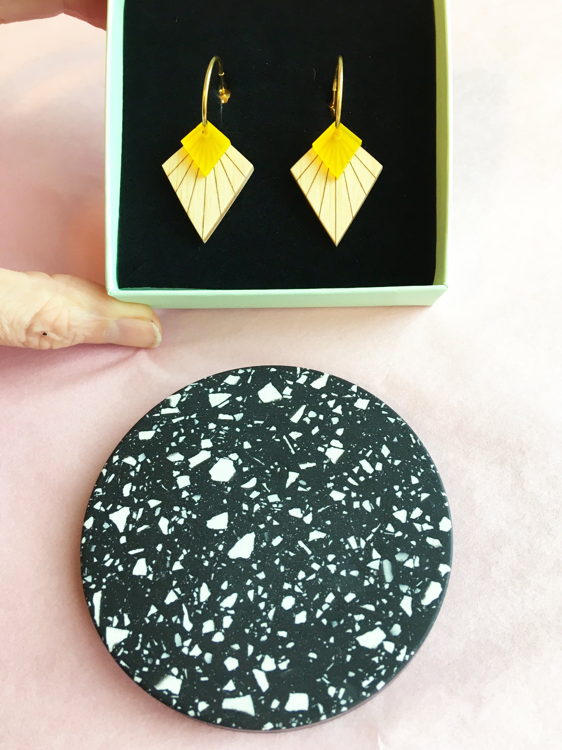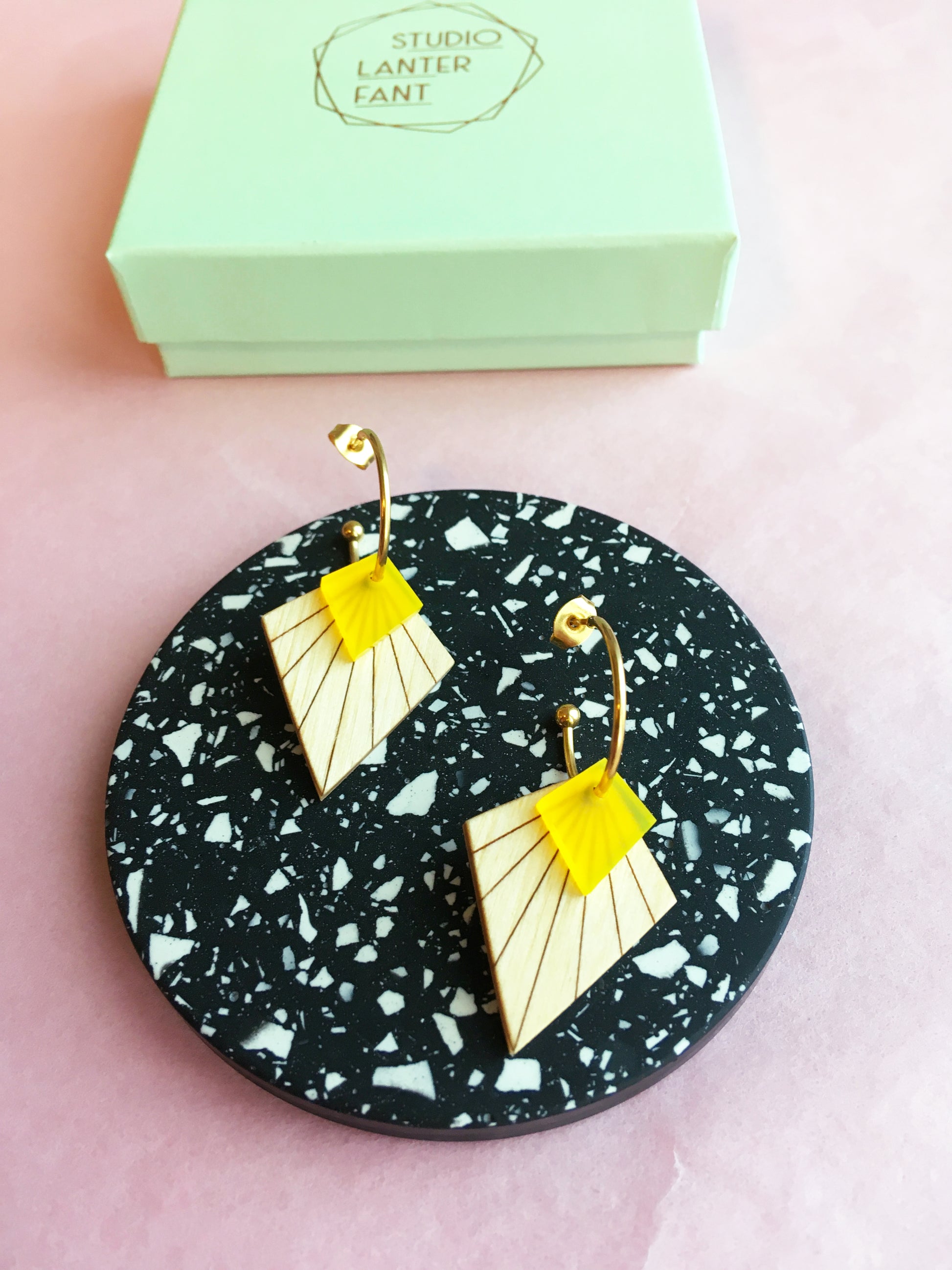 Deze ruitvormige oorringen zijn geïnspireerd door de Art Deco stijl. Je vindt ze in verschillende varianten, allemaal in een lekker kleurtje. Dit is de houten variant met een kleine Gele ruit van gerecycled kunststof.