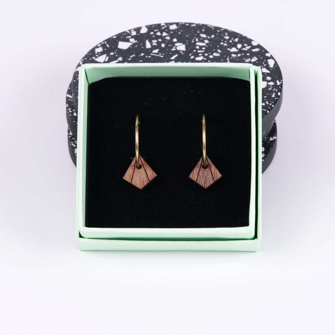 Deze ruitvormige oorringen zijn geïnspireerd door de Art Deco stijl. Je vindt ze in verschillende varianten, dit is de kleine noten houten Lot aan een oorring.