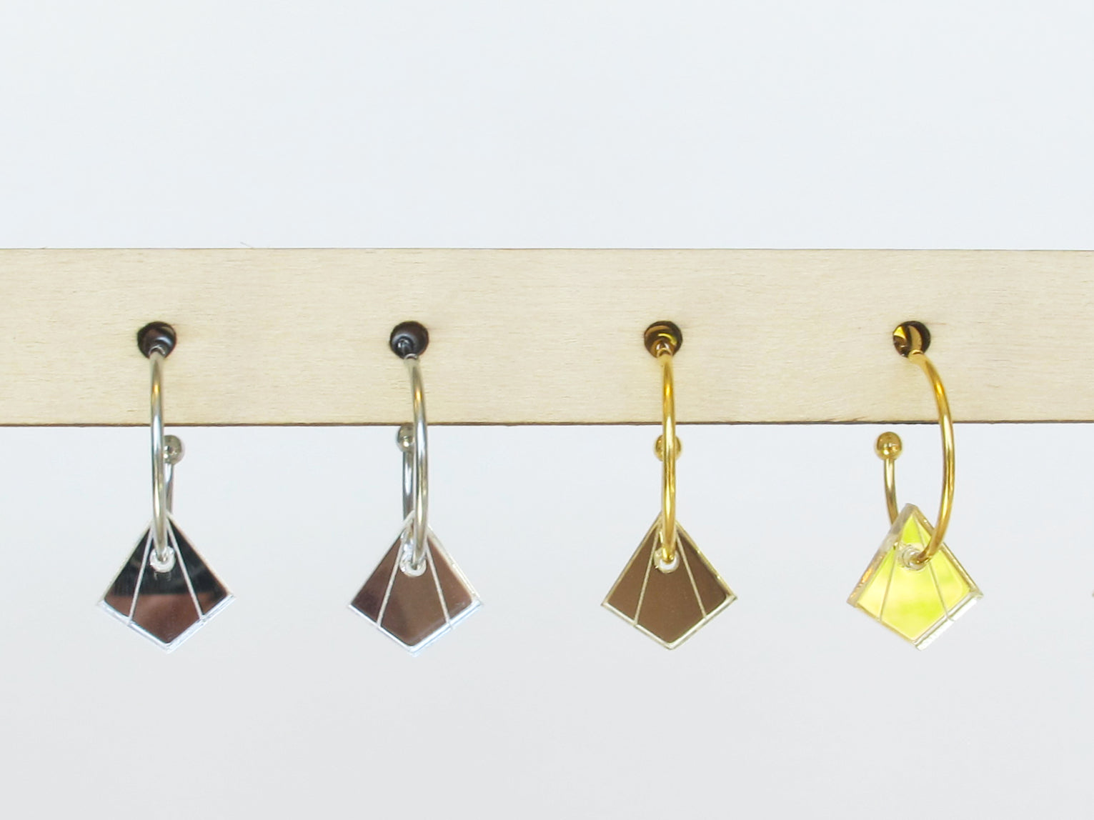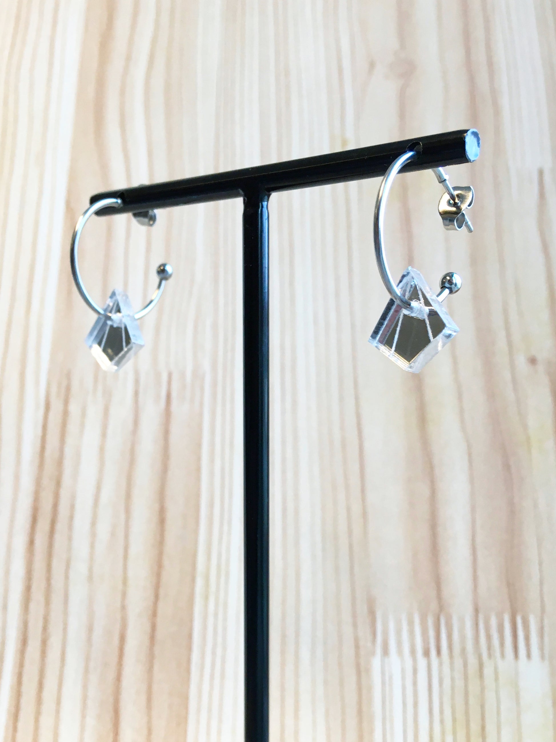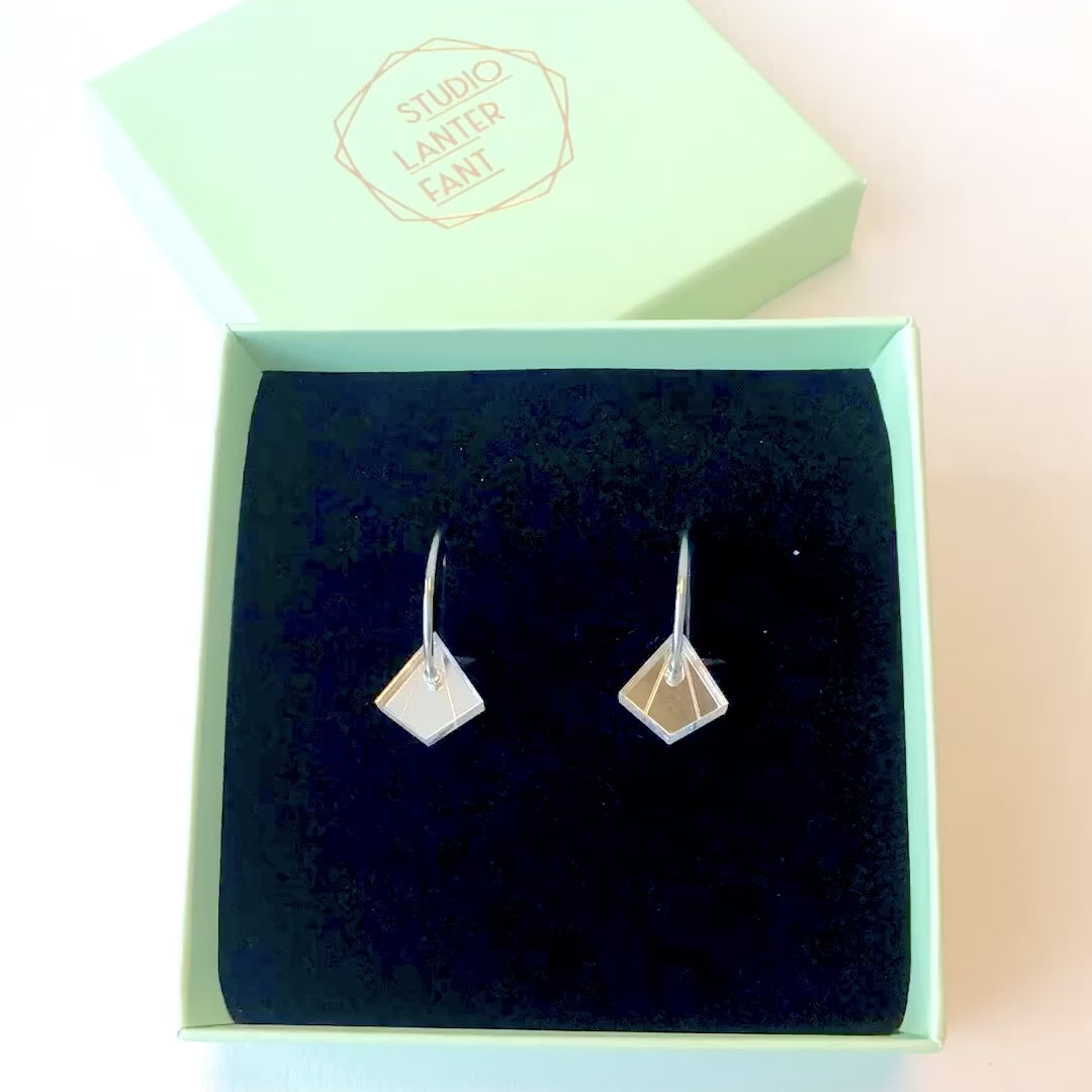 Deze ruitvormige oorringen zijn geïnspireerd door de Art Deco stijl. Je vindt ze in verschillende varianten, dit is de kleine zilveren Lot aan een oorring. Met optioneel een kettinkje eraan.