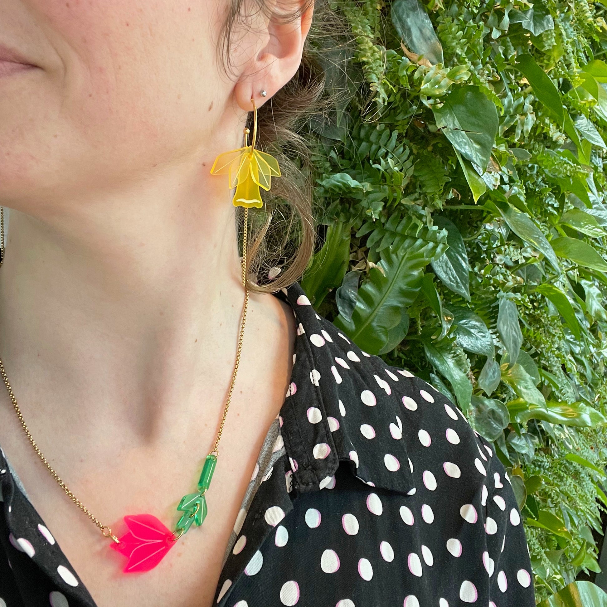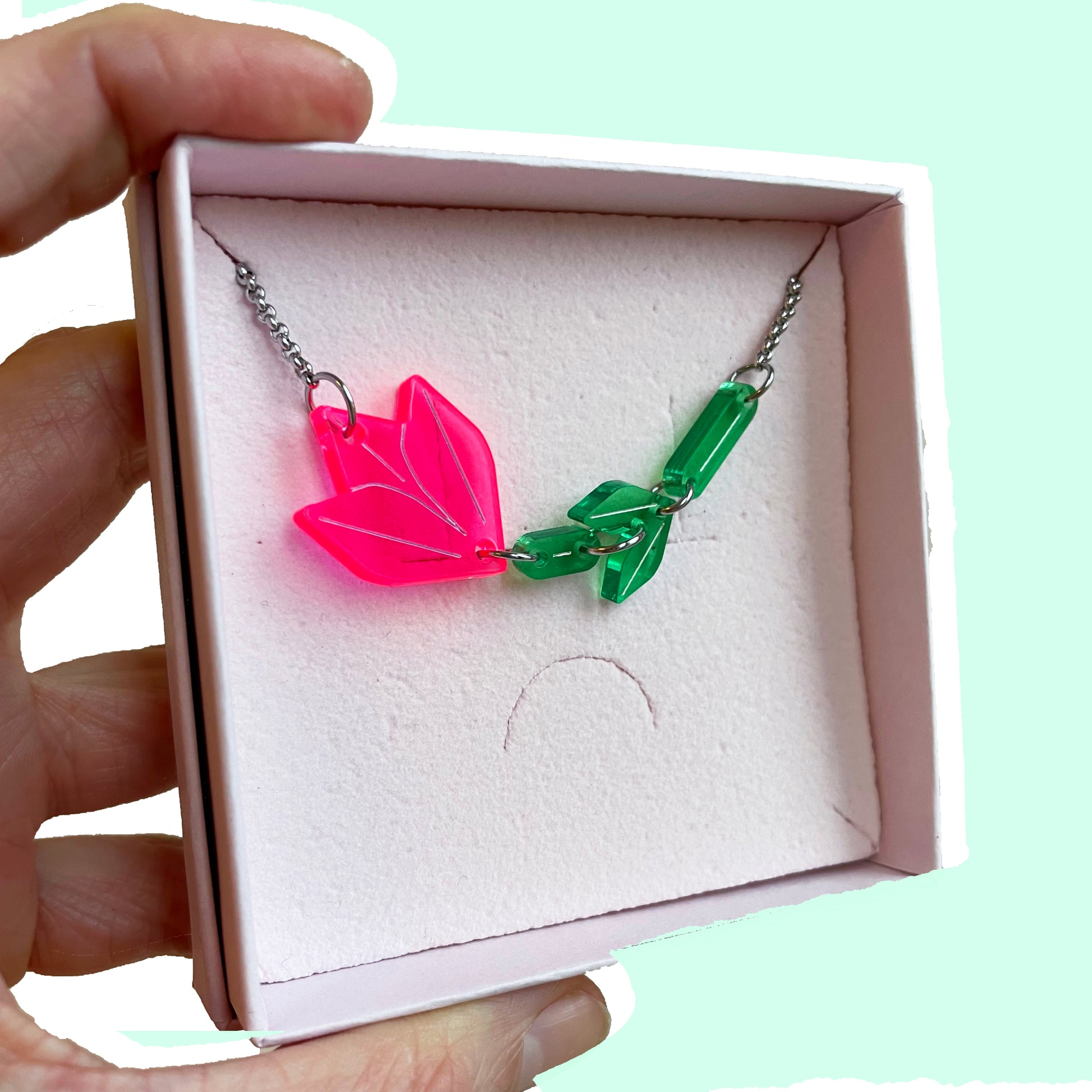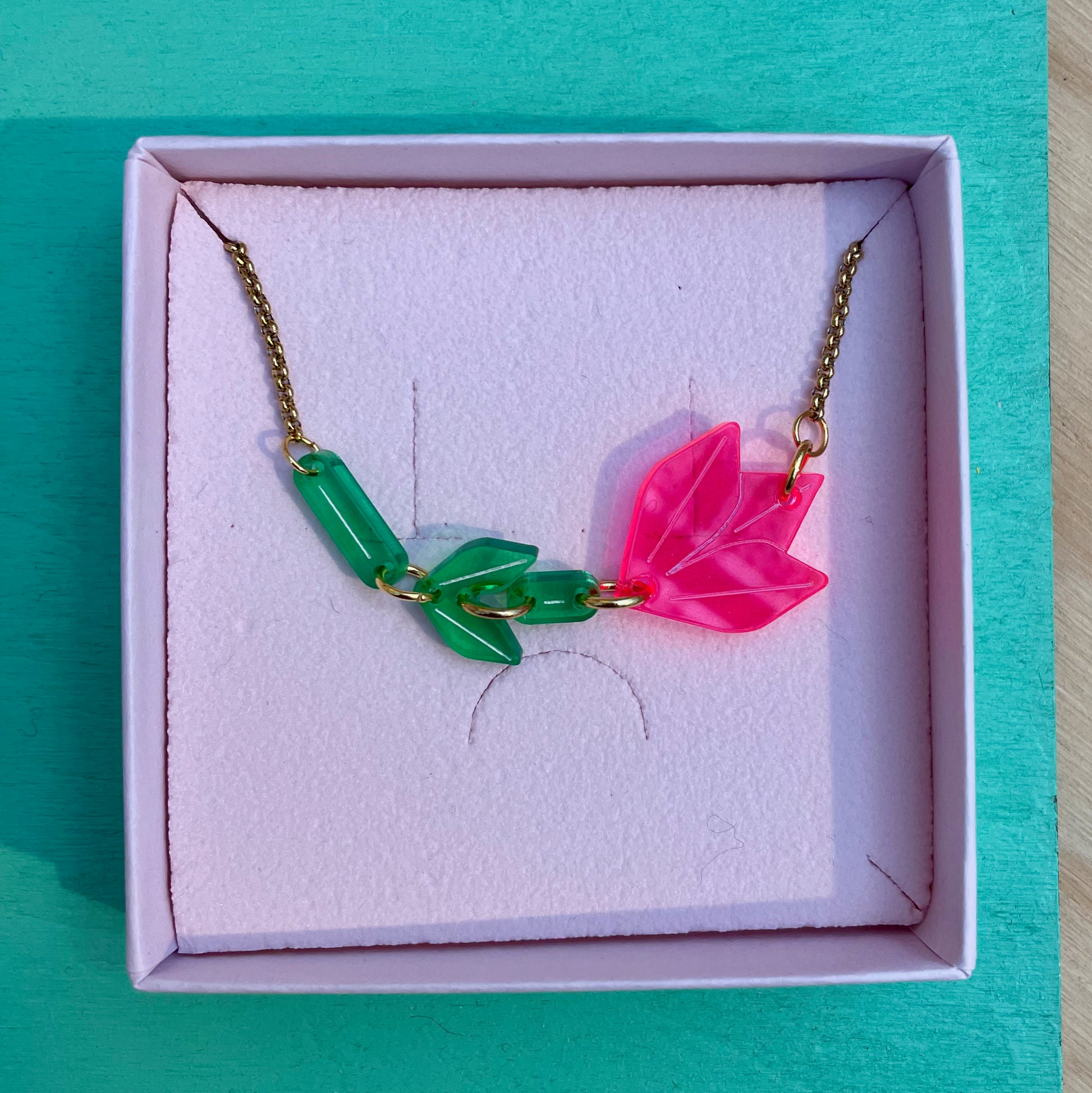 - tulp is gemaakt van neon roze en groen gerecycled kunststof