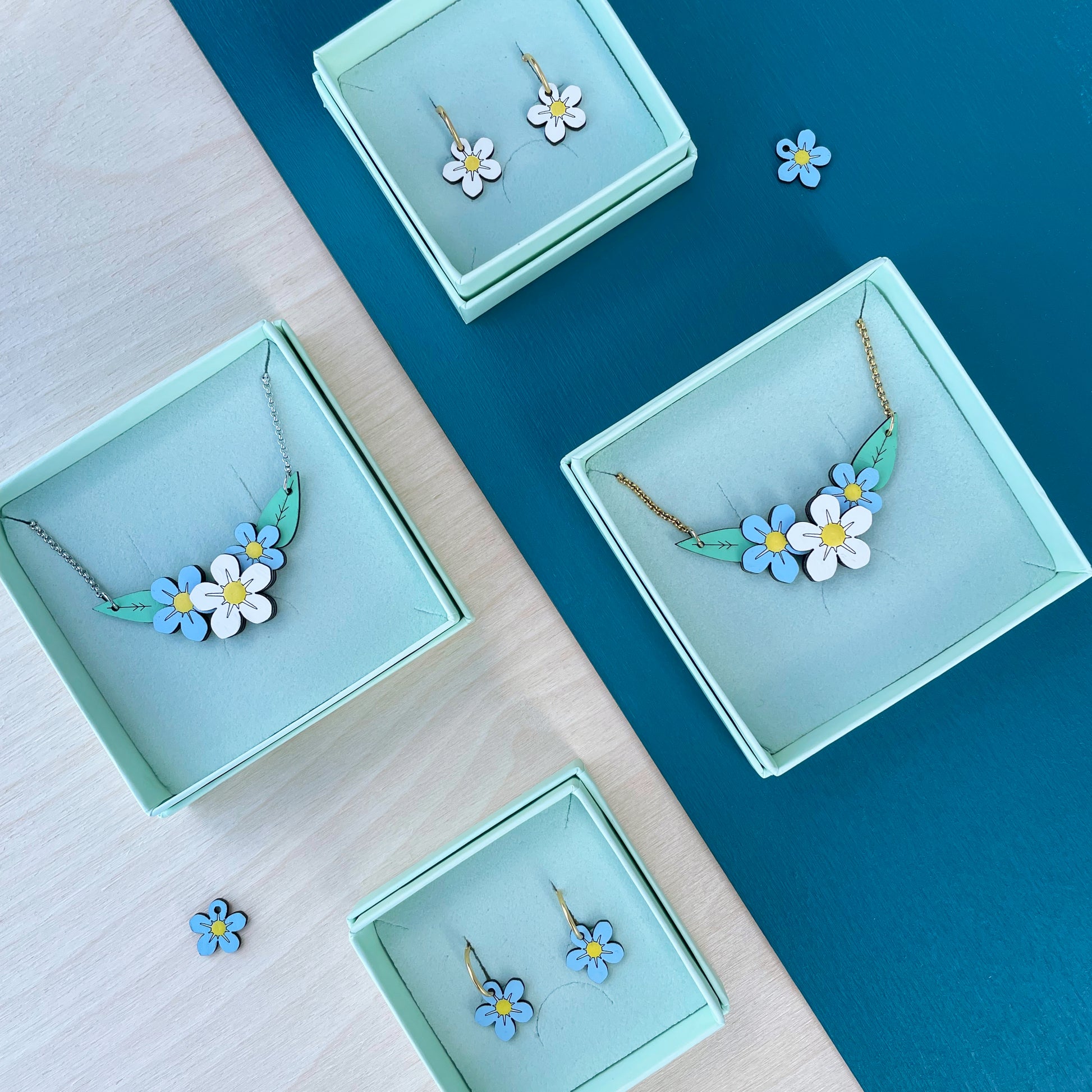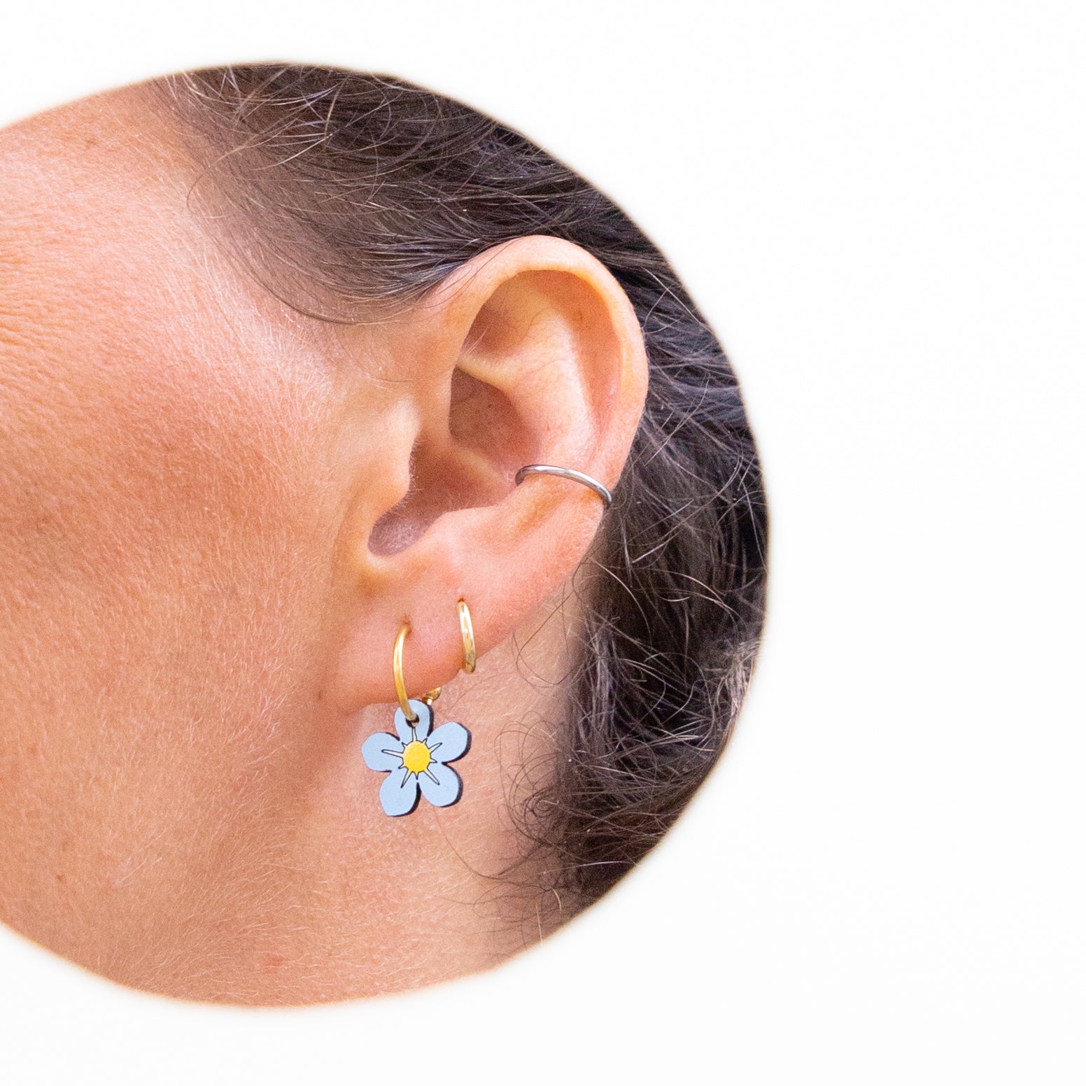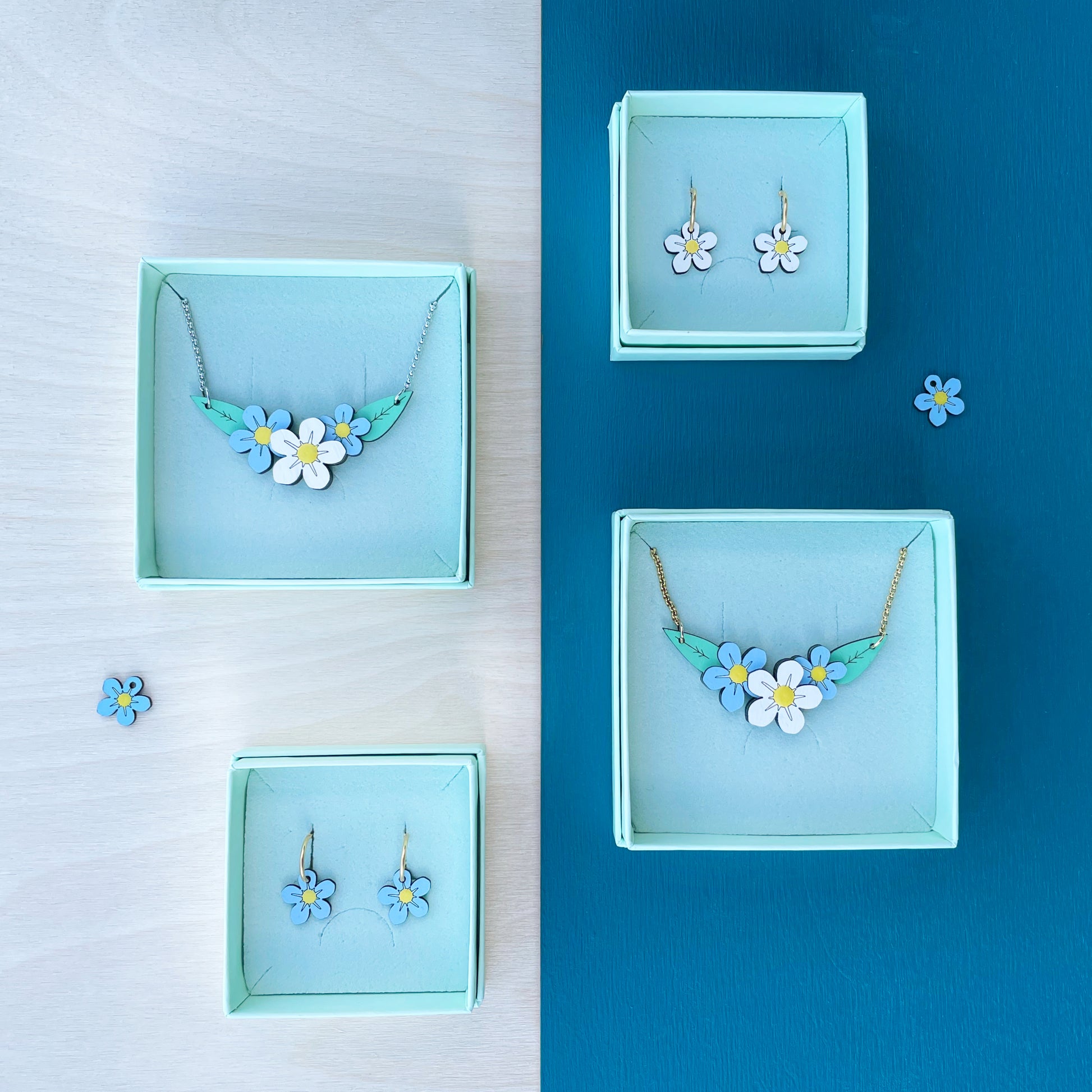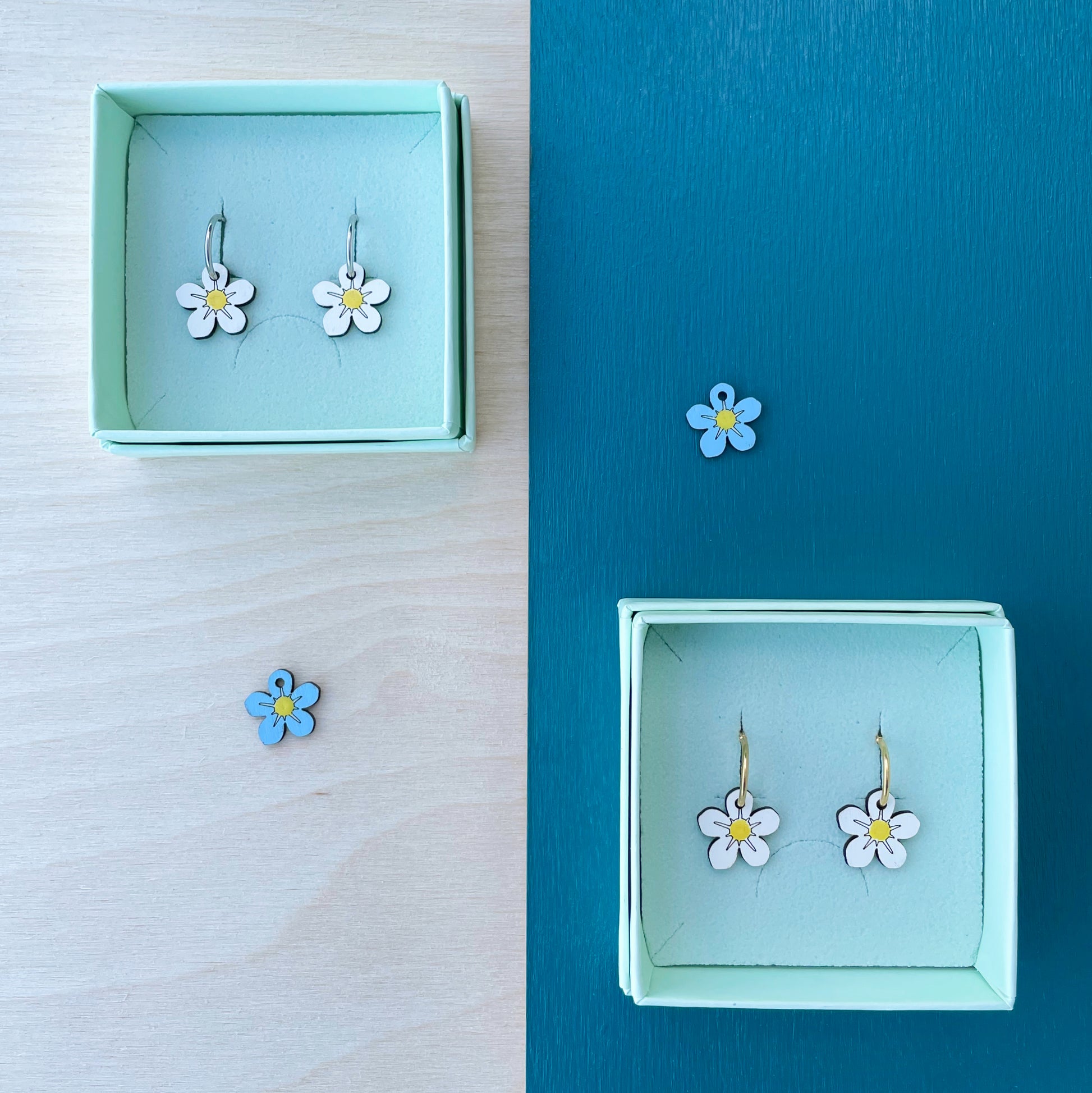 Het vergeet-mij-nietje is ook los verkrijgbaar als oorbel in het wit en blauw of als ketting. De foto's zijn ter illustratie van de verschillende opties.