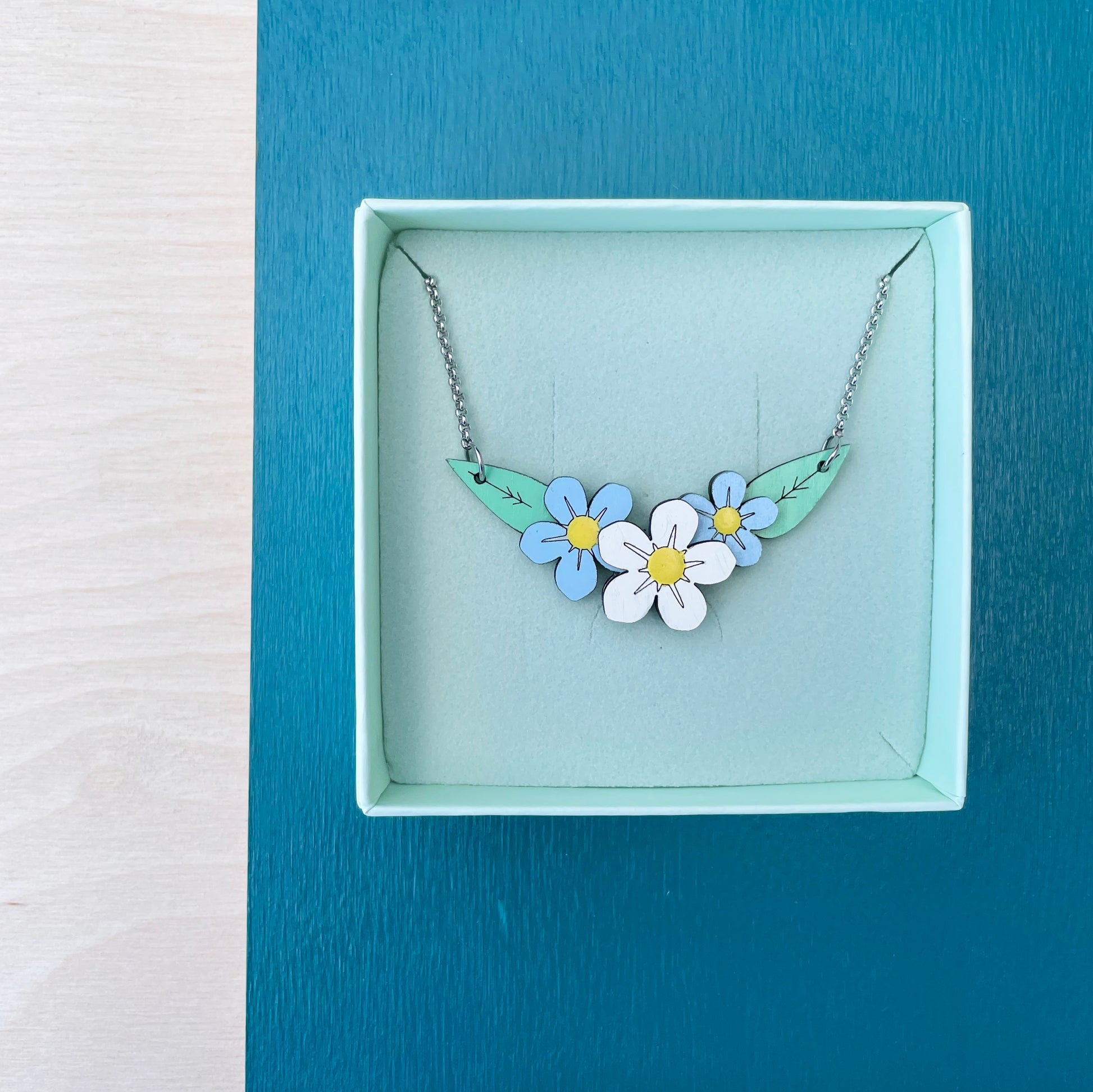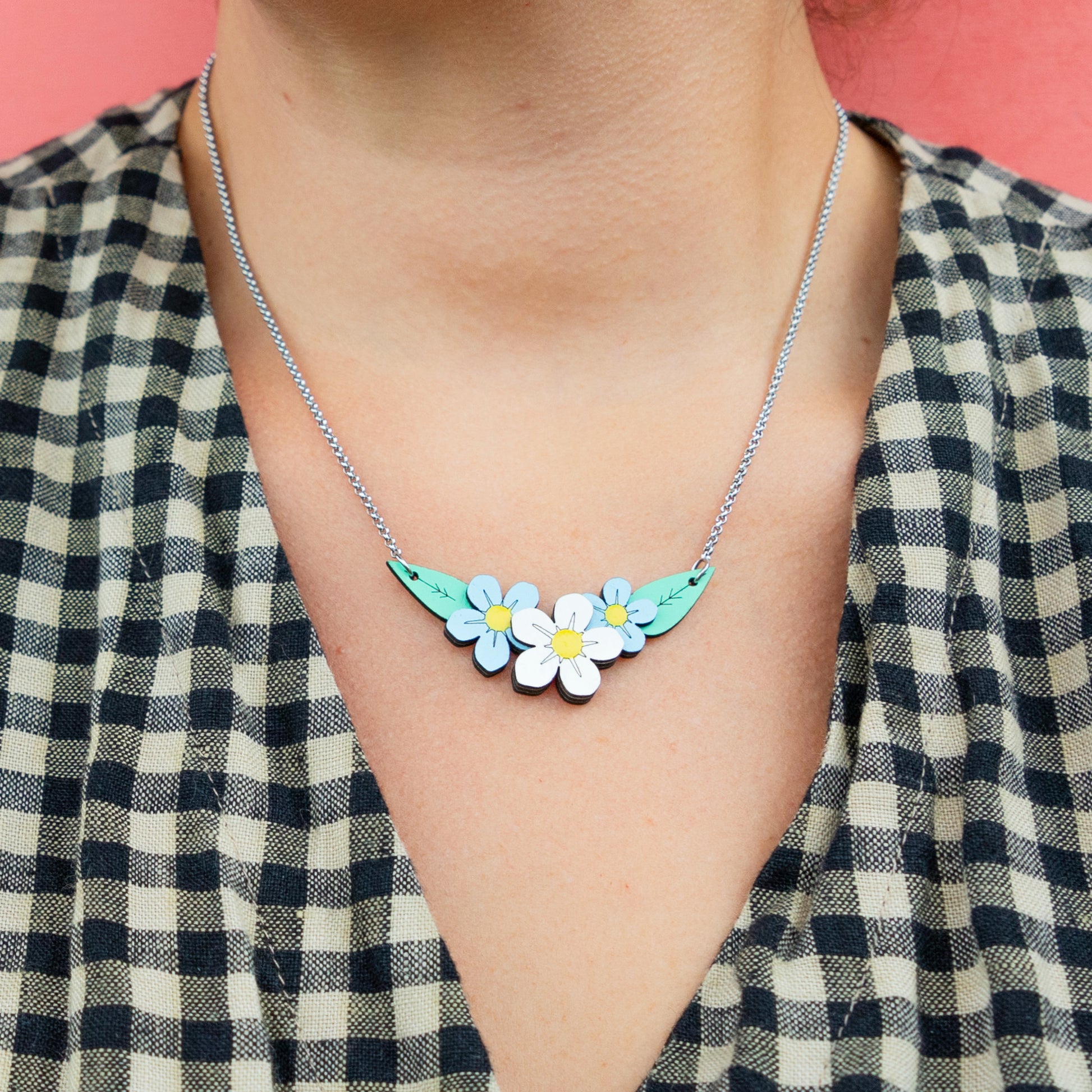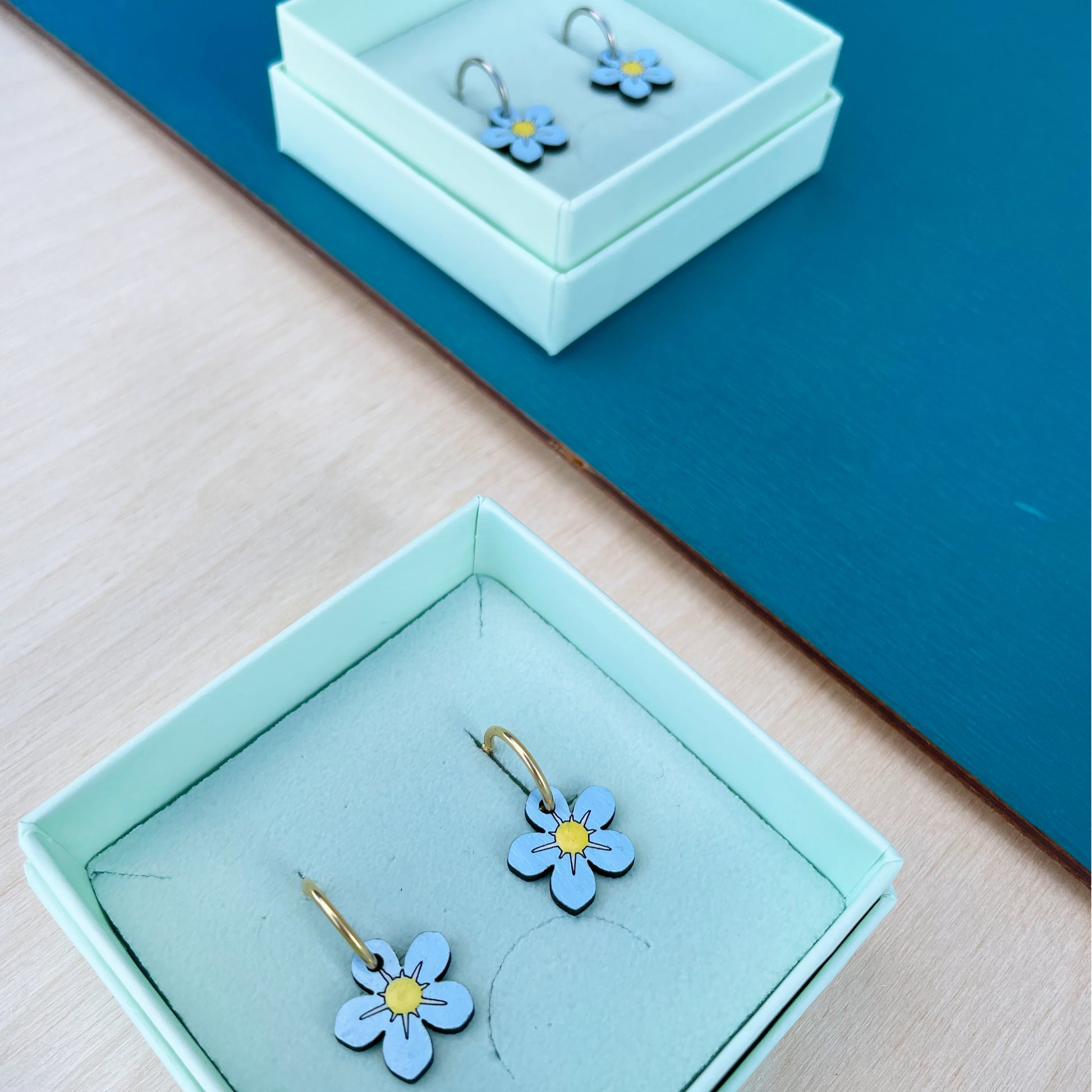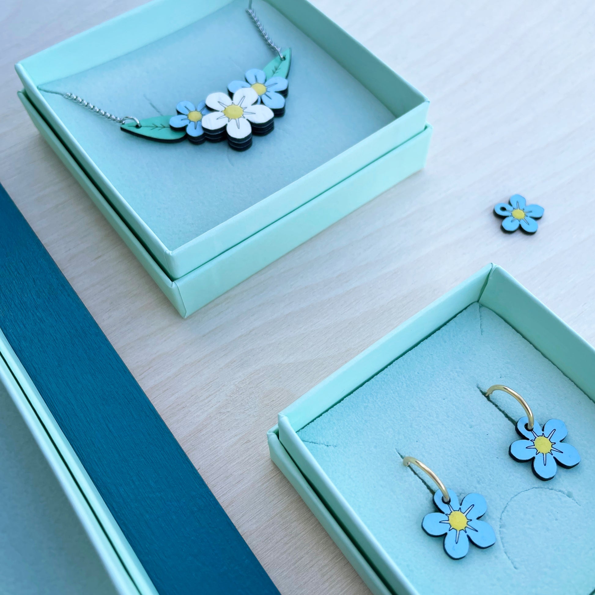 Het vergeet-mij-nietje is ook los verkrijgbaar als oorbel in het wit en blauw of als ketting. De foto's zijn ter illustratie van de verschillende opties.